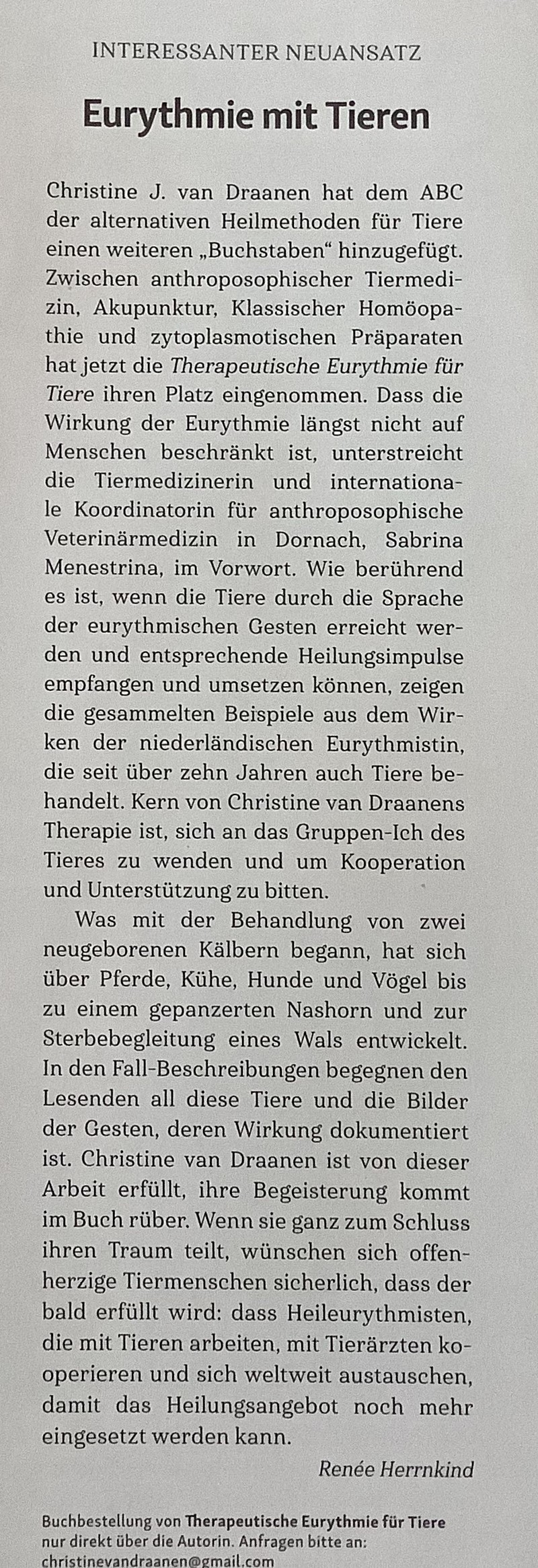 In Het Duitse tijdschrift Info3 verscheen onlangs een recensie van het boek dat Christine v. Draanen publiceerde over het werken met dieren door middel van eurythmie.